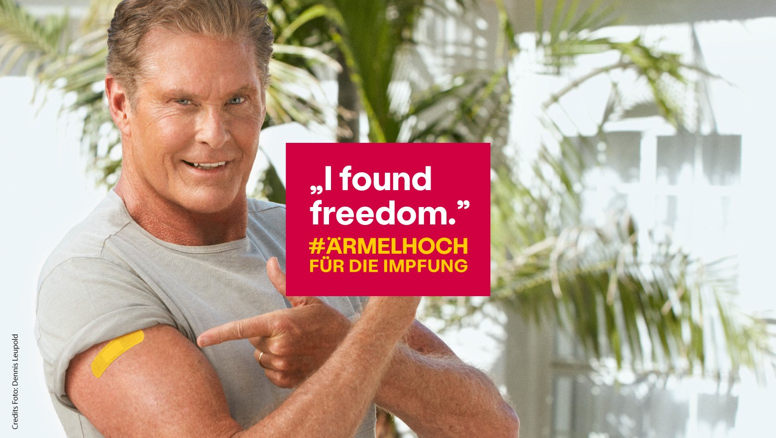 Meine Freiheit war die Impfung. Ärmel hoch Gesundheitsministerium wirbt mit David Hasselhoff fürs Impfen. In zwei Videos ruft der Schauspieler und Sänger dazu auf sich impfen zu lassen.